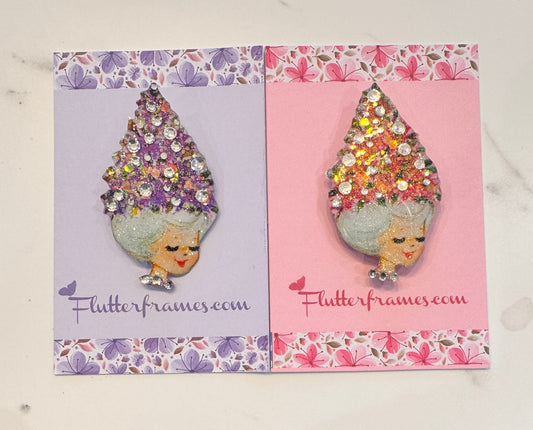 Vintage Old Lady with Flowers Brooch – Handmade Illustrated Jewellery from Recycled Tin Cans – Eco-Friendly Gift