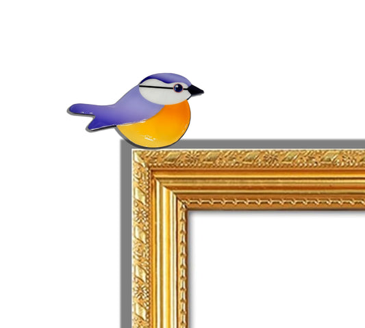 Blue Tit door frame topper. Bird sitting on a door frame, picture rail, or similar. Made from recycled tin cans