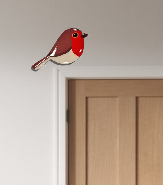 Robin door frame topper. Bird sitting on a door frame, picture rail, or similar. Made from recycled tin cans