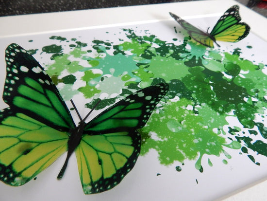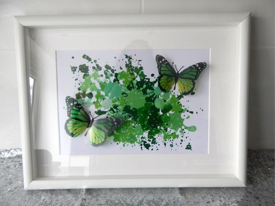 This is my water colour styled print, designed by Flutterframes, with 2, 3d acetate butterflies. The butterflies stand away from the print on a tiny plinth, the wings are slightly bent, which gives it the amazing 3d effect.