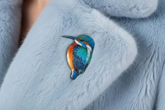 A striking handcrafted pin featuring the vibrant beauty of a kingfisher, made from recycled tin cans and finished with a super-shiny resin.