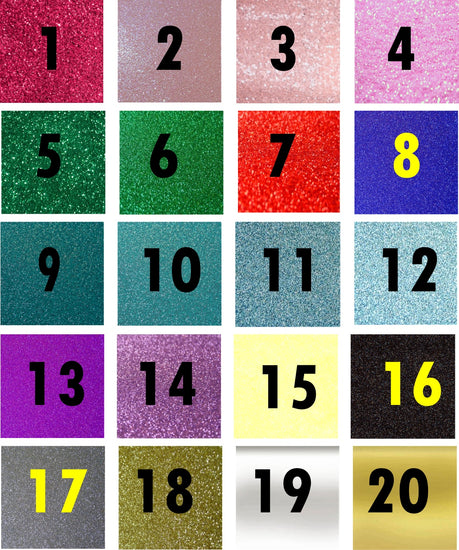 1.Fuchsia pink glitter, 2.Dusky pink glitter, 3.Light pink glitter, 4.Sugar pink glitter ,5.Emerald Green glitter, 6.Green glitter, 7.Red glitter, 8.Royal blue glitter, 9. Turquoise glitter, Dark turquoise glitter, 11.Dusky blue glitter, 12.Light blue glitter, 13.Purple glitter, 14.Lilac glitter, 15.Lemon yellow glitter, 16.Black glitter, 17.Silver glitter, 18.Gold glitter, 19. Metallic silver, 20.Metallic gold. 21.Silver glitter and metallic, 22.Gold glitter and metallic.