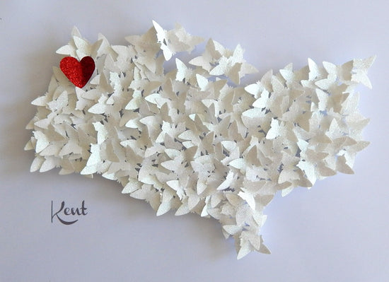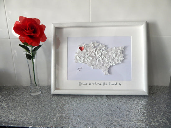 Brighten up an empty wall with this gorgeous 3D wall art. These pictures are sure to get noticed. Each piece is made up of a swarm of individual butterflies, punched by hand from the finest, glitter paper. Using miniature plinths of varying lengths, the butterflies are carefully secured into the swarm, the butterflies are set away from the background creating a unique 3D effect.